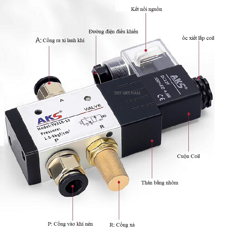 Phương thức hoạt động: Hoạt động bằng cơ chế dẫn hướng bằng khí nén (Pilot-oriented mode), được điều khiển bởi cuộn coil điện từ (solenoid coil).