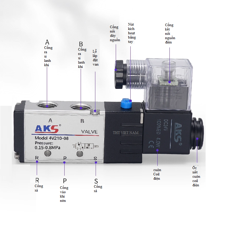 Các Cổng Khí (Air Ports): Bao gồm cổng cấp P, cổng làm việc A,B (nối với xi lanh) và cổng xả R,S.